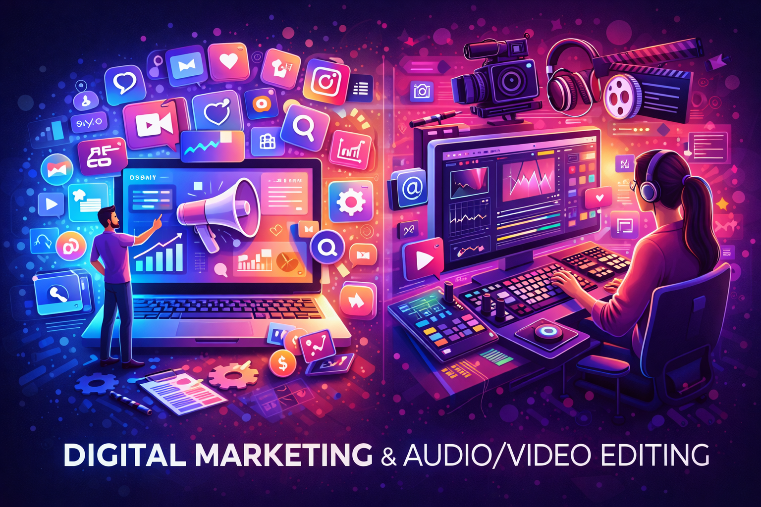 Digital Marketing & Audio/Video Editing -Creiamo strategie di digital marketing per aumentare visibilità, follower e clienti online. Realizziamo inoltre editing professionale di audio e video per contenuti social, YouTube e campagne pubblicitarie, rendendo ogni progetto più coinvolgente e di alta qualità.